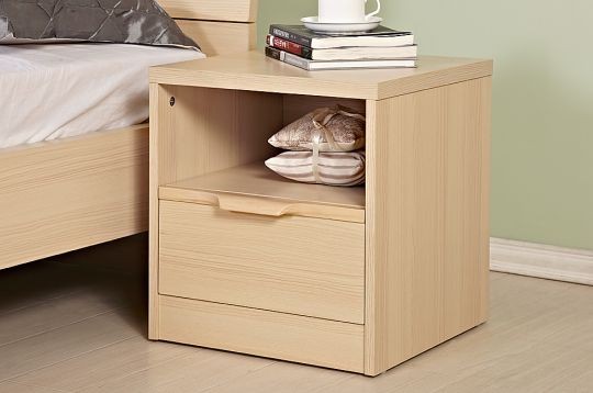 床头柜选购: 1、若只需要将少量物品收放在床头柜中,选择带单层抽屉的床头柜就足够了,而且也不占用空 间。